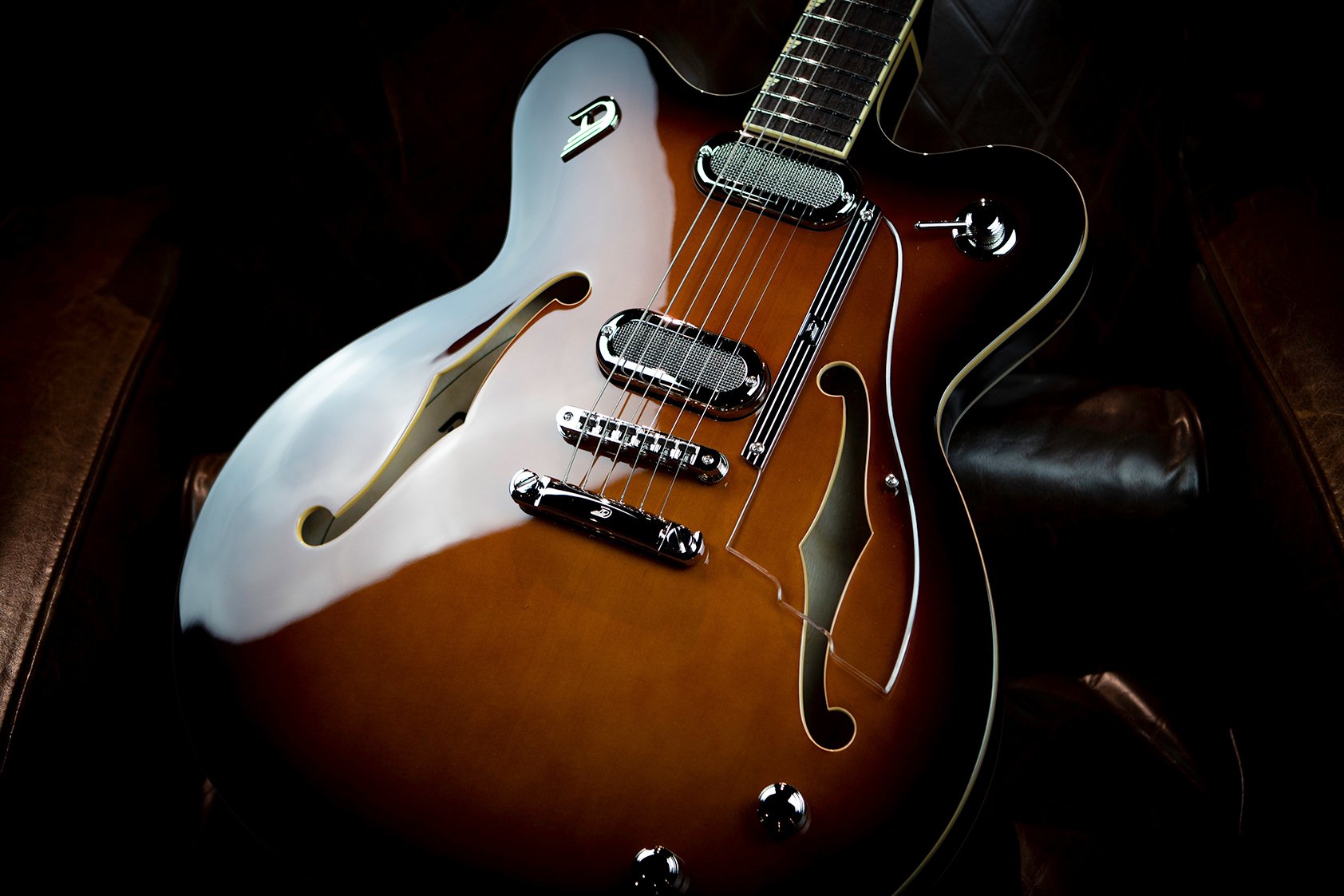 The Gran Majesto is available in two variations: The double cutaway version comes in a deep Catalina Green and is equipped with an aluminium stop-tailpiece for enhanced resonance transfer. The single cutaway version is available in a classic Vintage Burst sporting a Duesenberg Radiator Tremola. Both versions are only available in the above mentioned colours and hardware configurations.